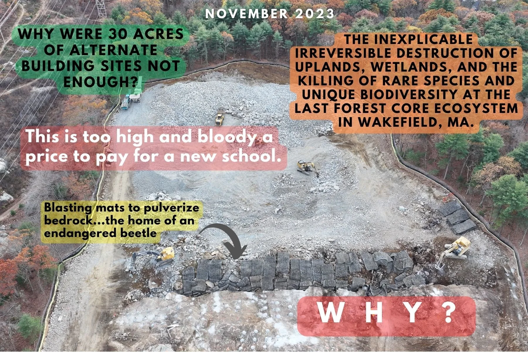 The heart of the beautiful NEMT Forest has been turned into a barren wasteland, destroying over 2000 mature trees and understory of unique plants, and killing all the wildlife in the area in blatant disregard to the climate and biodiversity crises. Any survivors, including beetles, moss, and lichen, are currently being blasted away, with the overpressure and high temperatures burning and sterilizing nutrient-rich topsoil and subsoil layers, annihilating soil-dwelling organisms and the mycorrhizal network. They have already filled up and destroyed non-jurisdictional wetlands and are planning to build a road right through the jurisdictional wetlands. Wetlands are the lifeblood of ecosystems - they provide water for wildlife, serve as habitats, and are crucial for storing and cycling water essential for our survival, so it is important to protect and preserve them regardless of their jurisdictional status. All this was avoidable and preventable, as there are alternate sites to move this project to and allow the forest to heal and recover through natural progression.